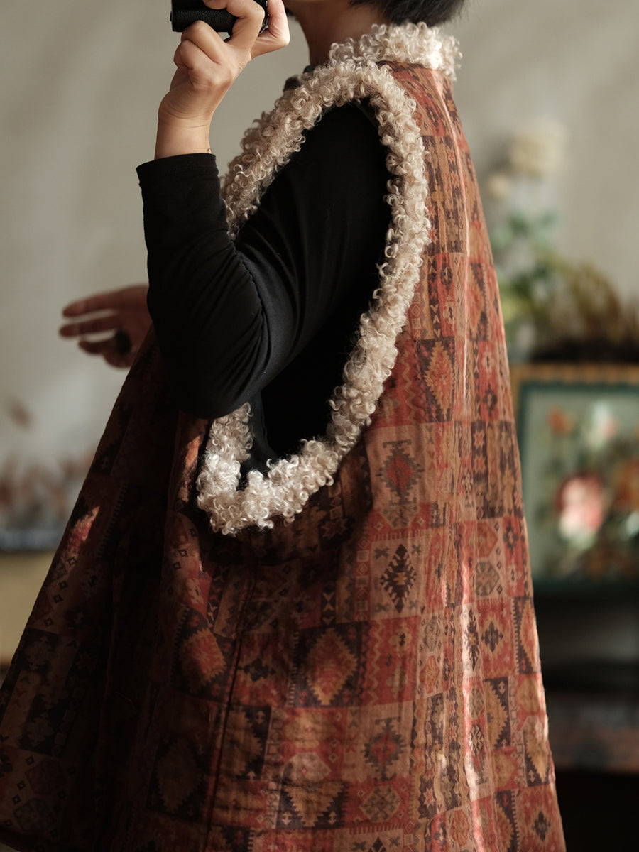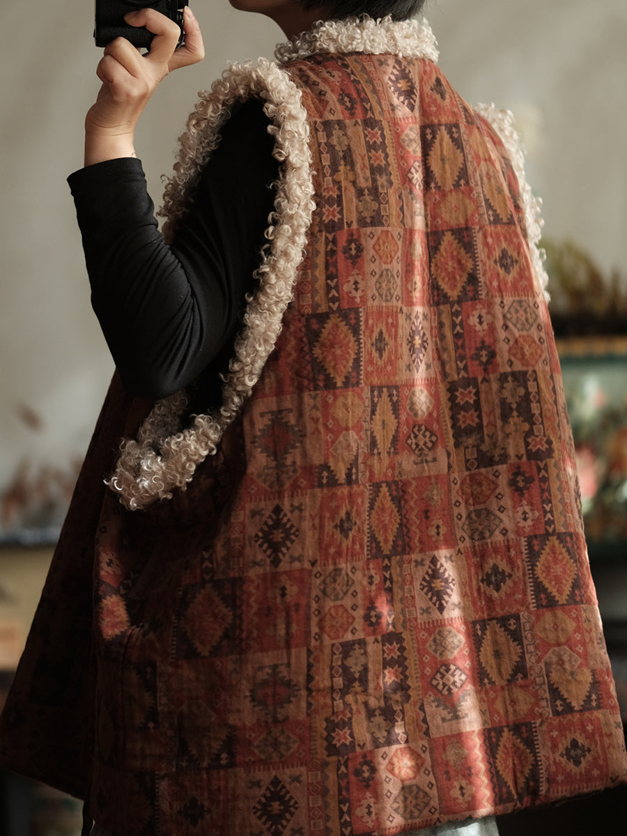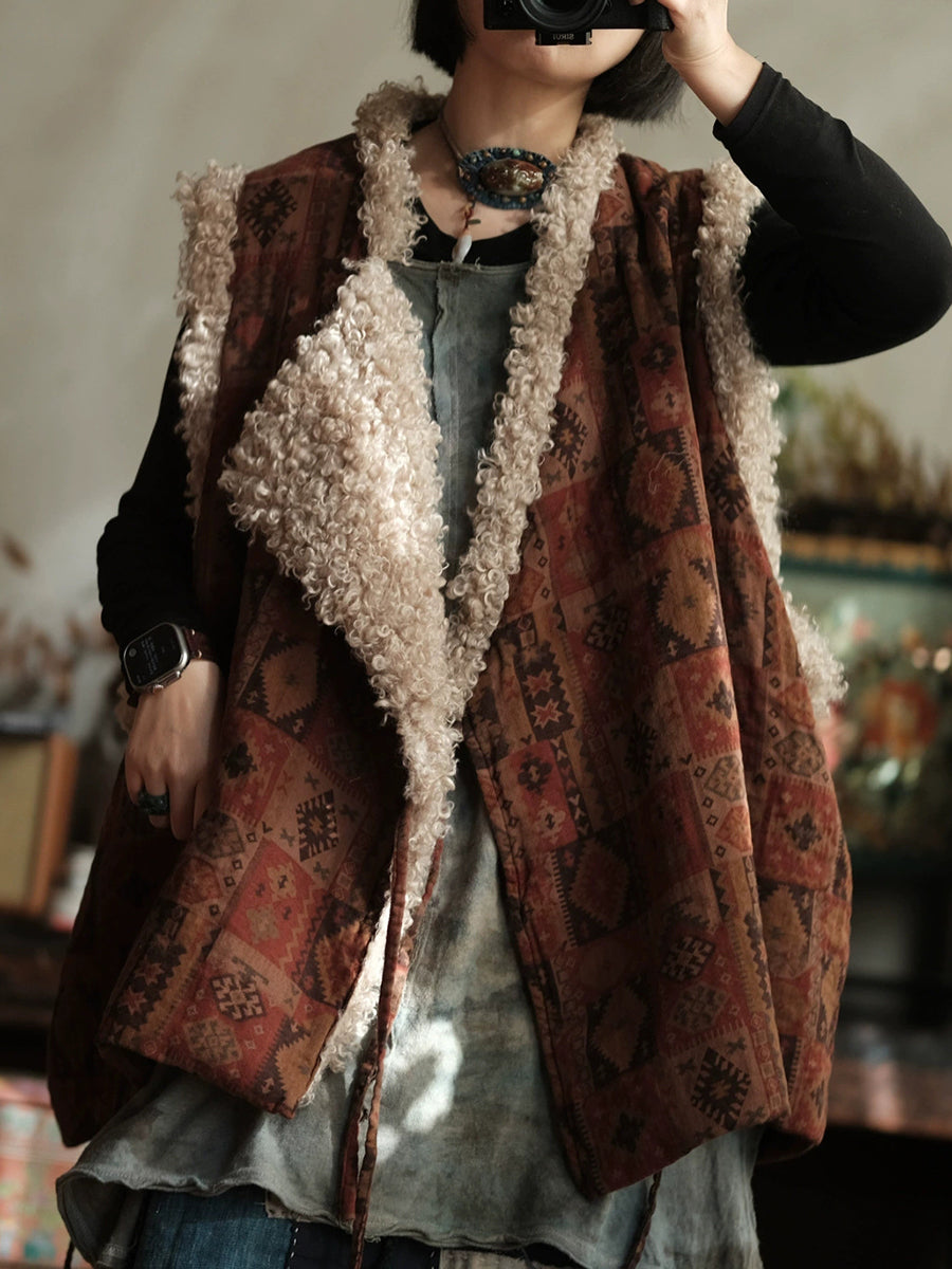 Chaleco polar con cuello en V y patchwork vintage de invierno para mujer